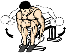 Supplemental: 3 x 20 bent lateral raises, 3 sets of dumbbell curls (I’d do pull-ups but don’t have a bar), either planks or crunches. I do the bent lateral raises for posterior deltoids, because, well, a well-defined posterior delt looks cool! The image below shows the form. You can also do these standing, but I don’t like it because the tendency to use legs and lower back is hard to avoid when standing. From the seated position, the legs are neutralized, and if you rest your chest on your thighs, your lower back is pretty well neutralized also. I do very light weight here – just 15lb. dumbbells. I also do my curls with 15lb dumbbells, for the simple reason that the only thing I have is 15 pounders. My sets are usually 30 or so reps apiece though. I don’t focus much on biceps because, for whatever reason, my biceps tend to stay pretty well-toned without a lot of effort.